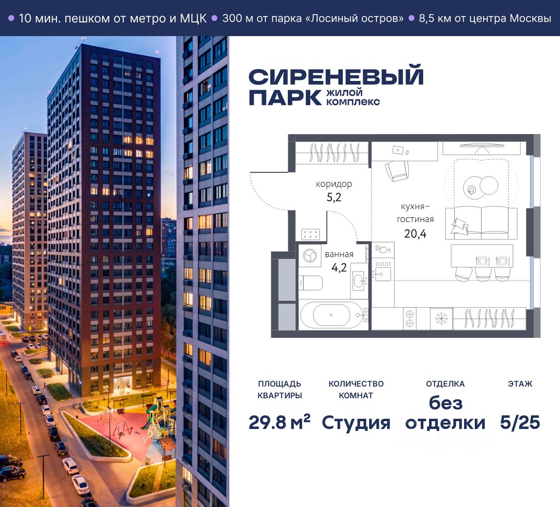 Продаётся просторная студия общей площадью 29.8 м² на 5 этаже в новом жилом комплексе "Сиреневый парк", расположенном в Восточном административном округе Москвы на улице Тагильская. Всего 10 минут ходьбы от станции метро "Бульвар Рокоссовского" и одноимённой платформы МЦК.