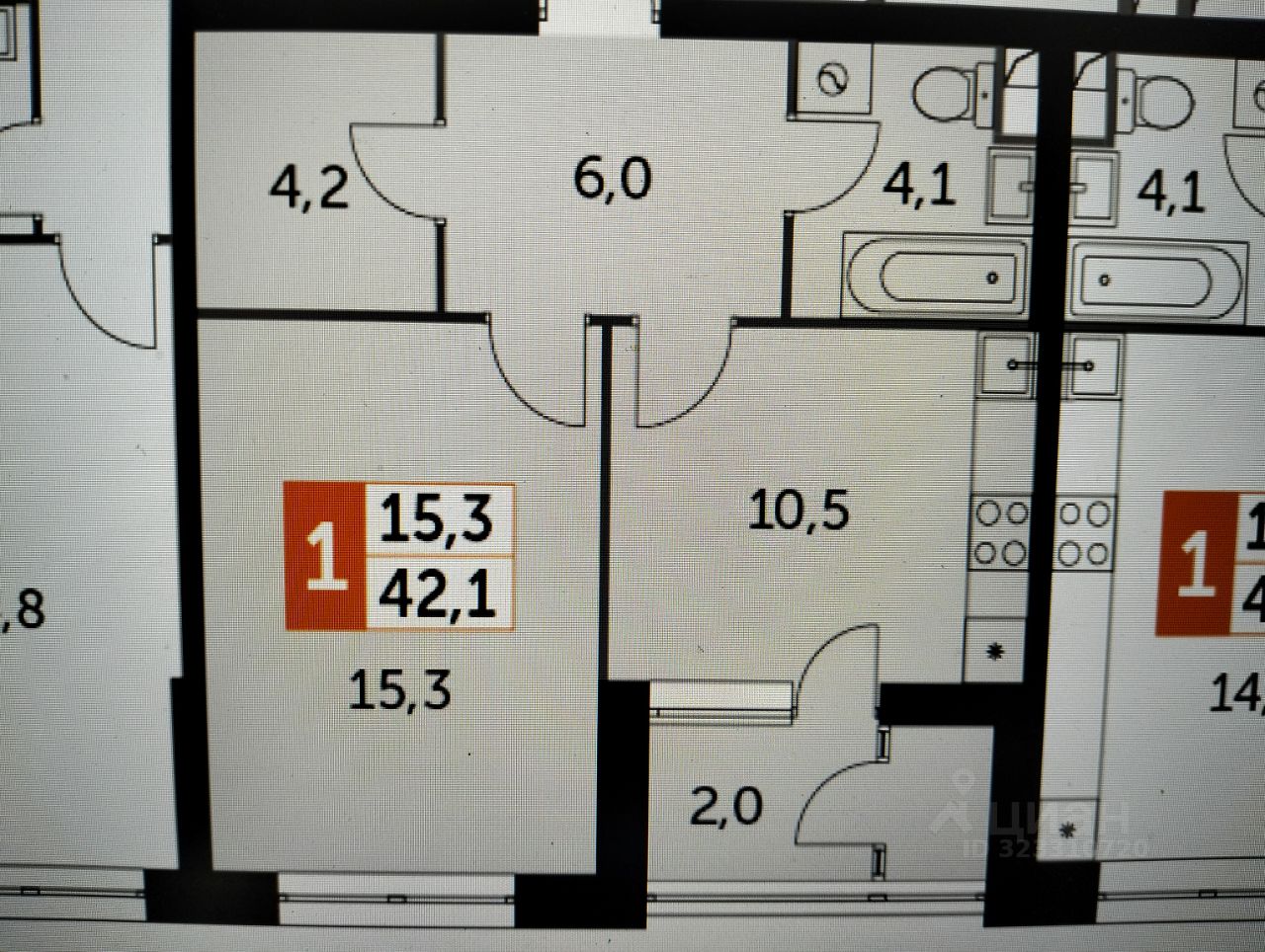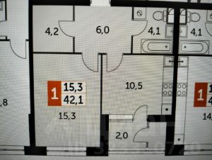 Общая площадь квартиры 42,1. Кухня 15,5 комната 15,3 кладовая 4,2, лоджия. С/у совмещен. Гардеробная - удобство для хранения вещей.