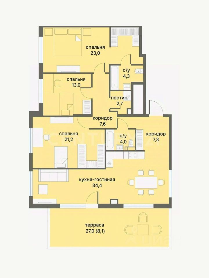 Площадь жилой зоны - 118 кв.м, площадь террасы - 27 кв.м (учитывается в общей площади с коэффициентом)