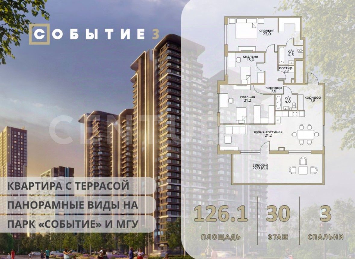 Предлагается шикарная видовая квартира с открытой террасой, на 30-ом этаже в ЖК бизнес-класса "Событие-3".