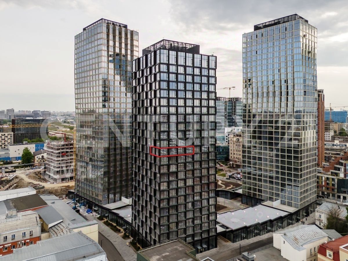 Планировка квартиры предусматривает: кухня с обеденной зоной, гостиная, две спальные комнаты, детская комната, гардеробная, холл, два санузла. Панорамное остекление, дизайнерское лобби с консьерж-сервисом.