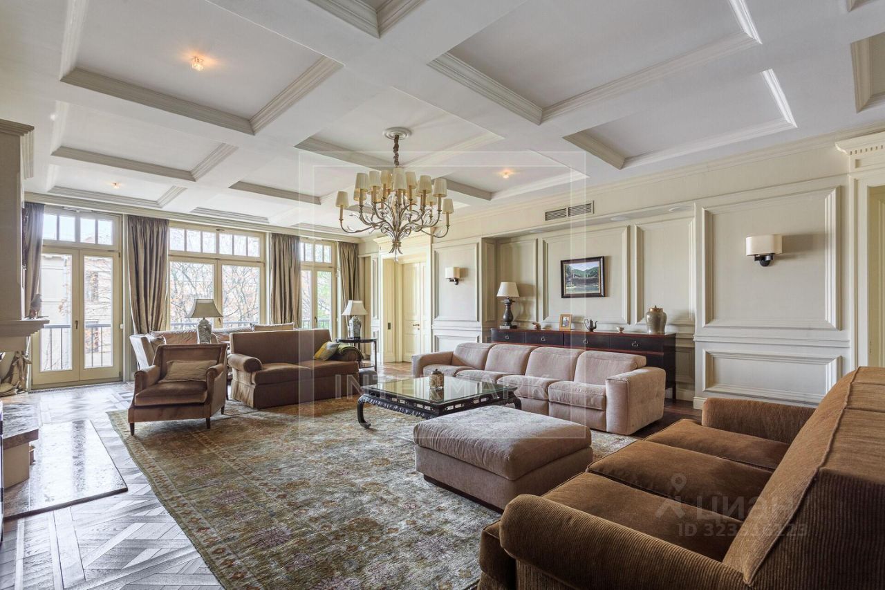 Предлагается просторная семейная квартира площадью 443,4 м² в элитном жилом комплексе "Дворянское Гнездо". Это полностью готовое к проживанию пространство с премиальной отделкой, отмеченное в дизайнерских журналах как "Проект года". Интерьер выдержан в спокойной бежевой гамме и теплых тонах дерева с использованием исключительно первоклассных материалов.
