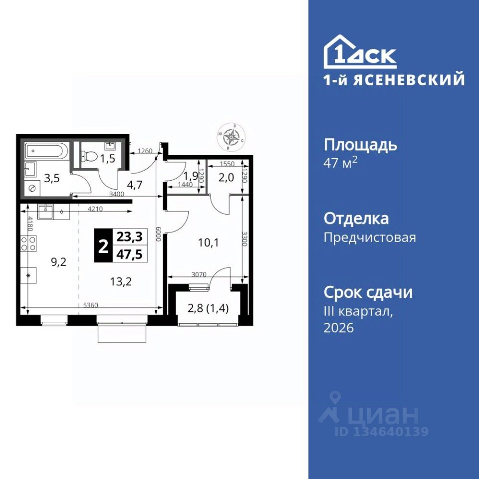 Продаётся 2-к квартира номер 534 общей площадью 47.5 кв.м. на 12-м этаже 18 этажного здания. Отделка Whitebox. Цена с учётом скидки.