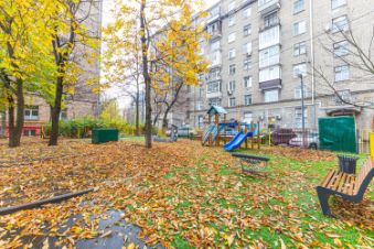 Тихий уютный сквер во дворе с лавочками и детской площадкой.