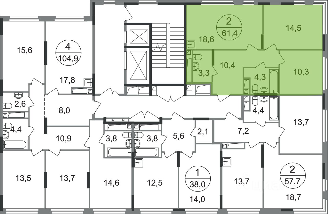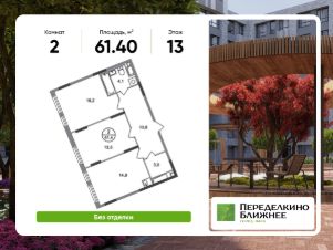 Общая площадь квартиры - 61,4 кв. м, этаж 13 из 17.