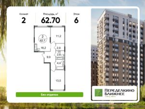 Общая площадь квартиры - 62,7 кв. м, этаж 6 из 17.