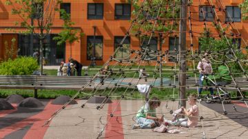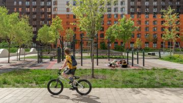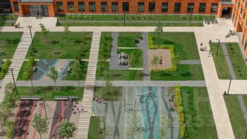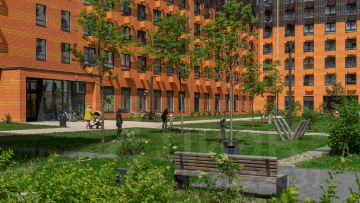 Современный жилой комплекс с благоустроенной территорией: зелёные дворы без машин, детские и спортивные площадки, прогулочные аллеи и вечерняя подсветка.
