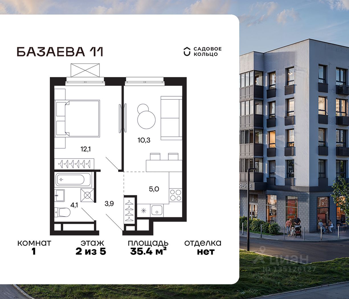 Продается квартира в ЖК "Базаева, 11" с 1 спальней на 2 этаже 5 этажного дома. Общая площадь: 35.4 кв.м. Высота потолков 2.72 м. Срок сдачи 2 квартал 2027 г. Эскроу-счет. Застройщик ГК "Садовое кольцо".