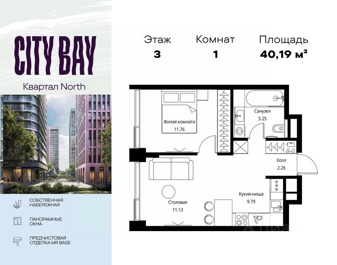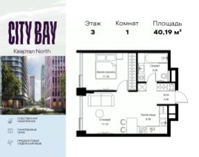 Продаётся 1-комнатная квартира общей площадью 40.19 м² с предчистовой отделкой в ЖК City Вау, квартале North, на 3-м этаже 27 этажного дома.