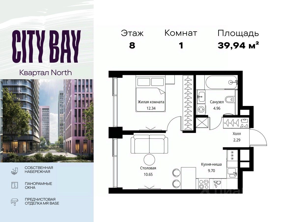 Продаётся 1-комнатная квартира общей площадью 39.94 м² с предчистовой отделкой в ЖК City Вау, квартале North, на 8-м этаже 27 этажного дома.