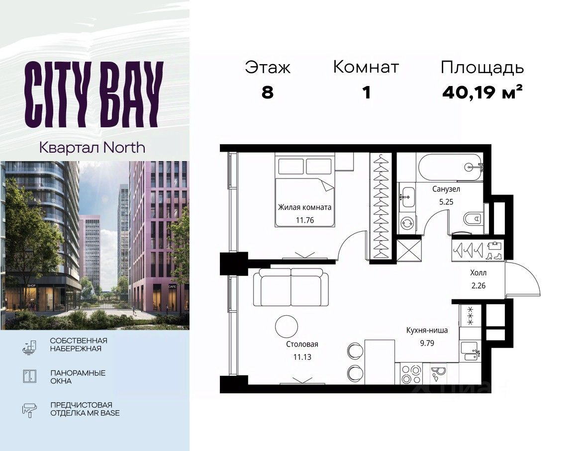 Продаётся 1-комнатная квартира общей площадью 40.19 м² с предчистовой отделкой в ЖК City Вау, квартале North, на 8-м этаже 27 этажного дома.