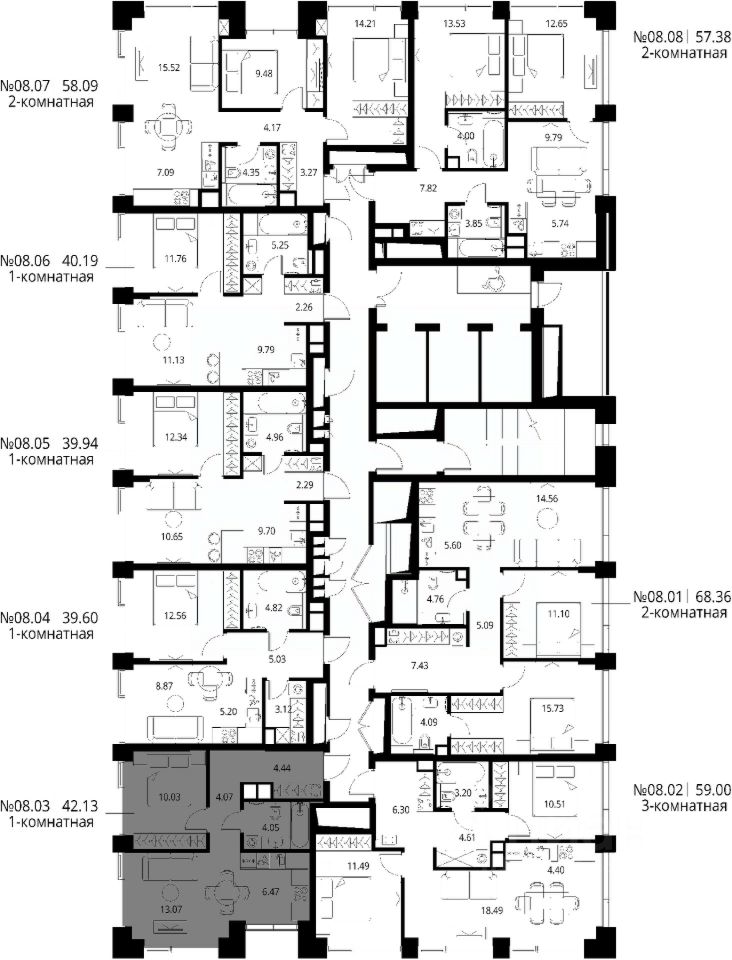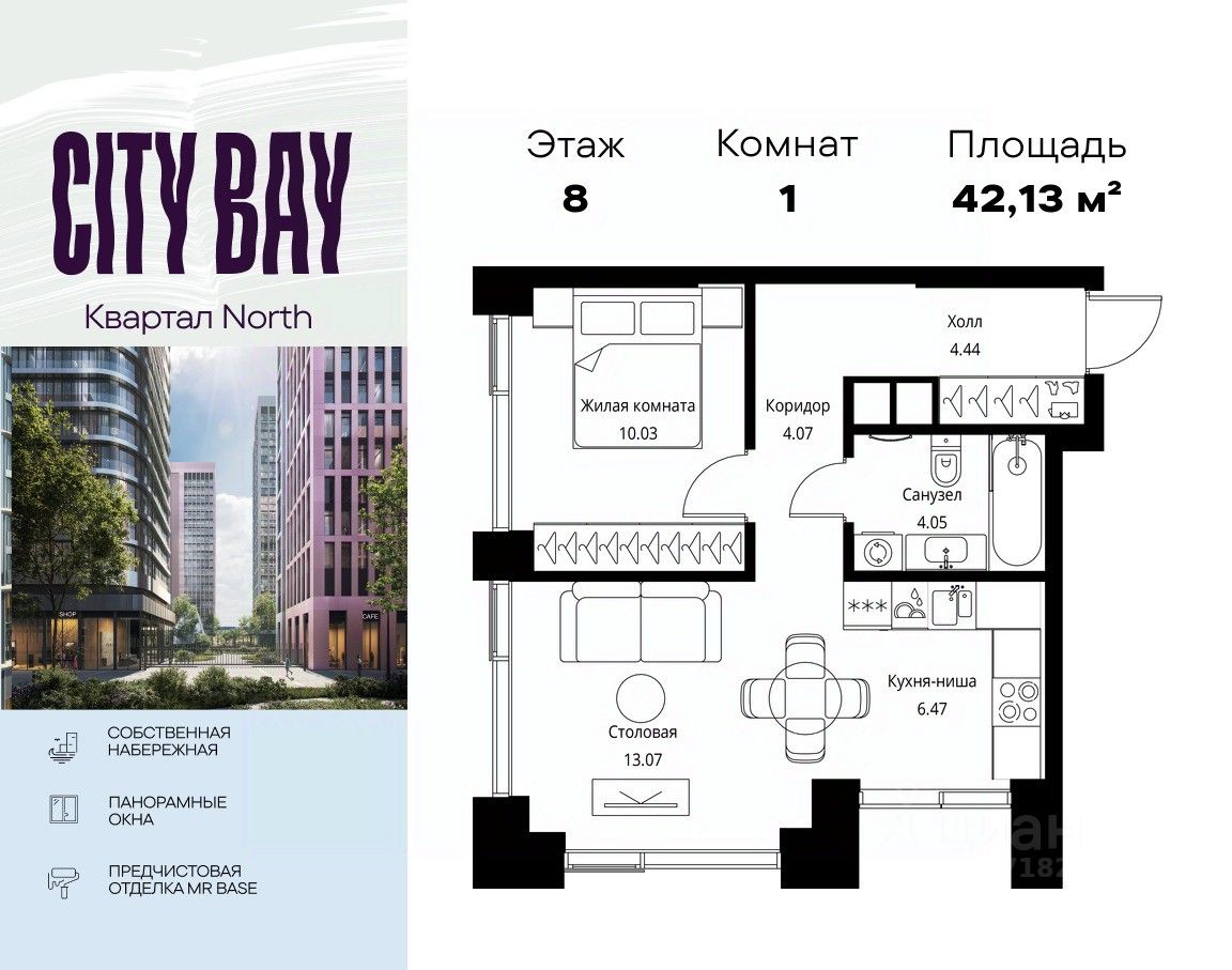 Продаётся 1-комнатная квартира общей площадью 42.13 м² с предчистовой отделкой в ЖК City Вау, квартале North, на 8-м этаже 27 этажного дома.