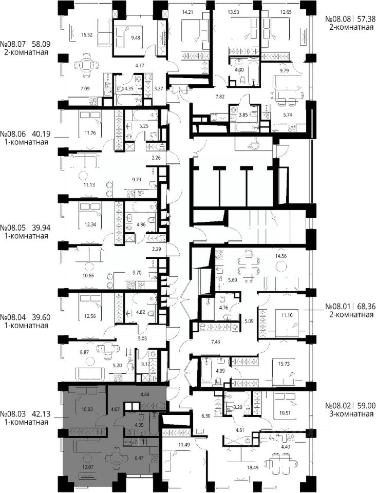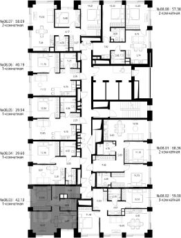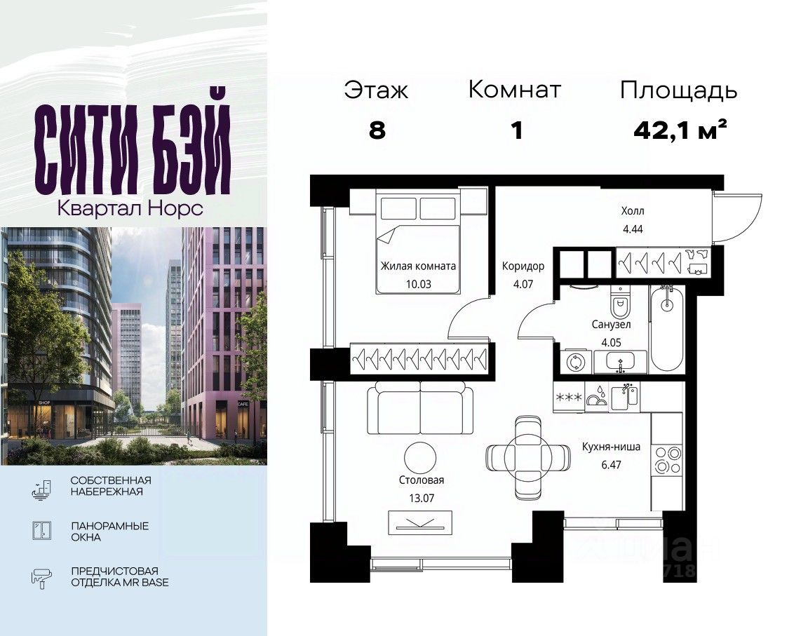 Продаётся 1-комнатная квартира общей площадью 42.13 м² с предчистовой отделкой в ЖК Сити Бэй, квартале Норс, на 8-м этаже 27 этажного дома.