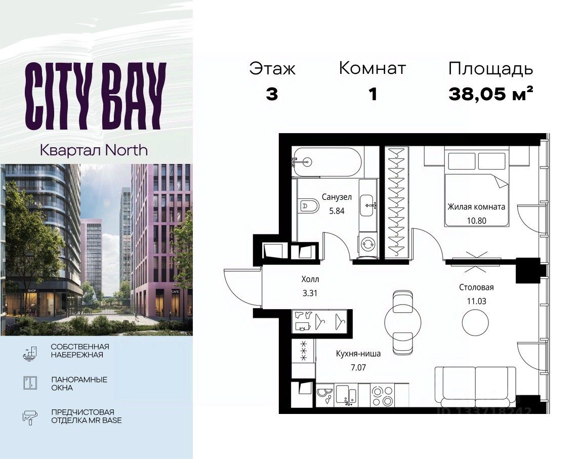 Продаётся 1-комнатная квартира общей площадью 38.05 м² с предчистовой отделкой в ЖК City Вау, квартале North, на 3-м этаже 49 этажного дома.