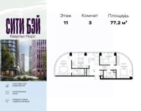 Продаётся 3-комнатная квартира общей площадью 77.18 м² с предчистовой отделкой в ЖК Сити Бэй, квартале Норс, на 11-м этаже 49 этажного дома.