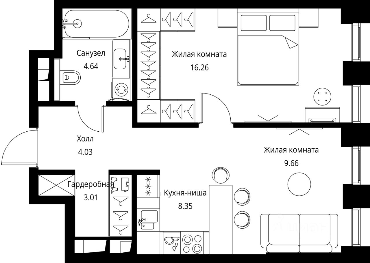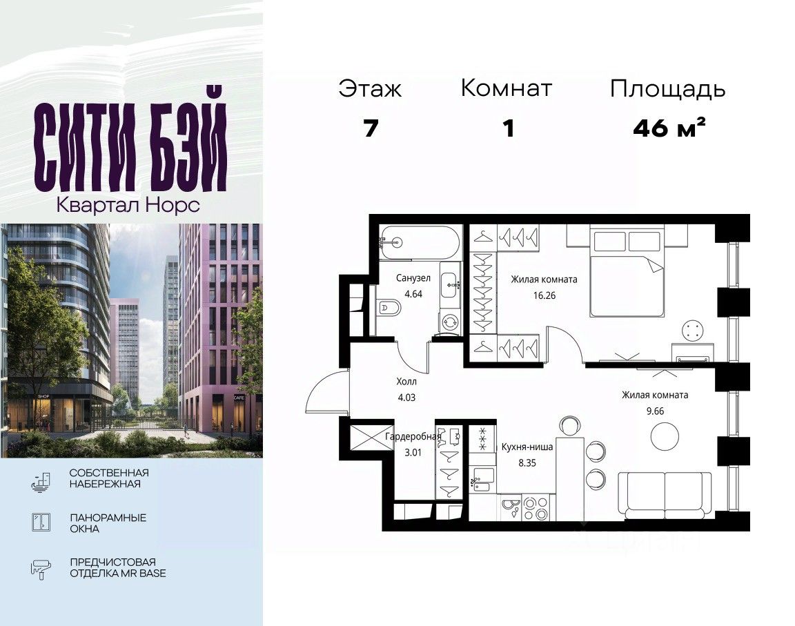 Продаётся 1-комнатная квартира общей площадью 45.95 м² с предчистовой отделкой в ЖК Сити Бэй, квартале Норс, на 7-м этаже 26 этажного дома.