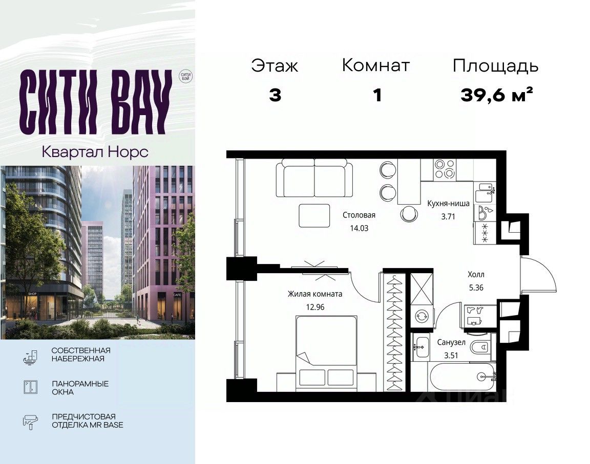 Продаётся 1-комнатная квартира общей площадью 39.57 м² с предчистовой отделкой в ЖК Сити Бэй, квартале Норс, на 3-м этаже 26 этажного дома.