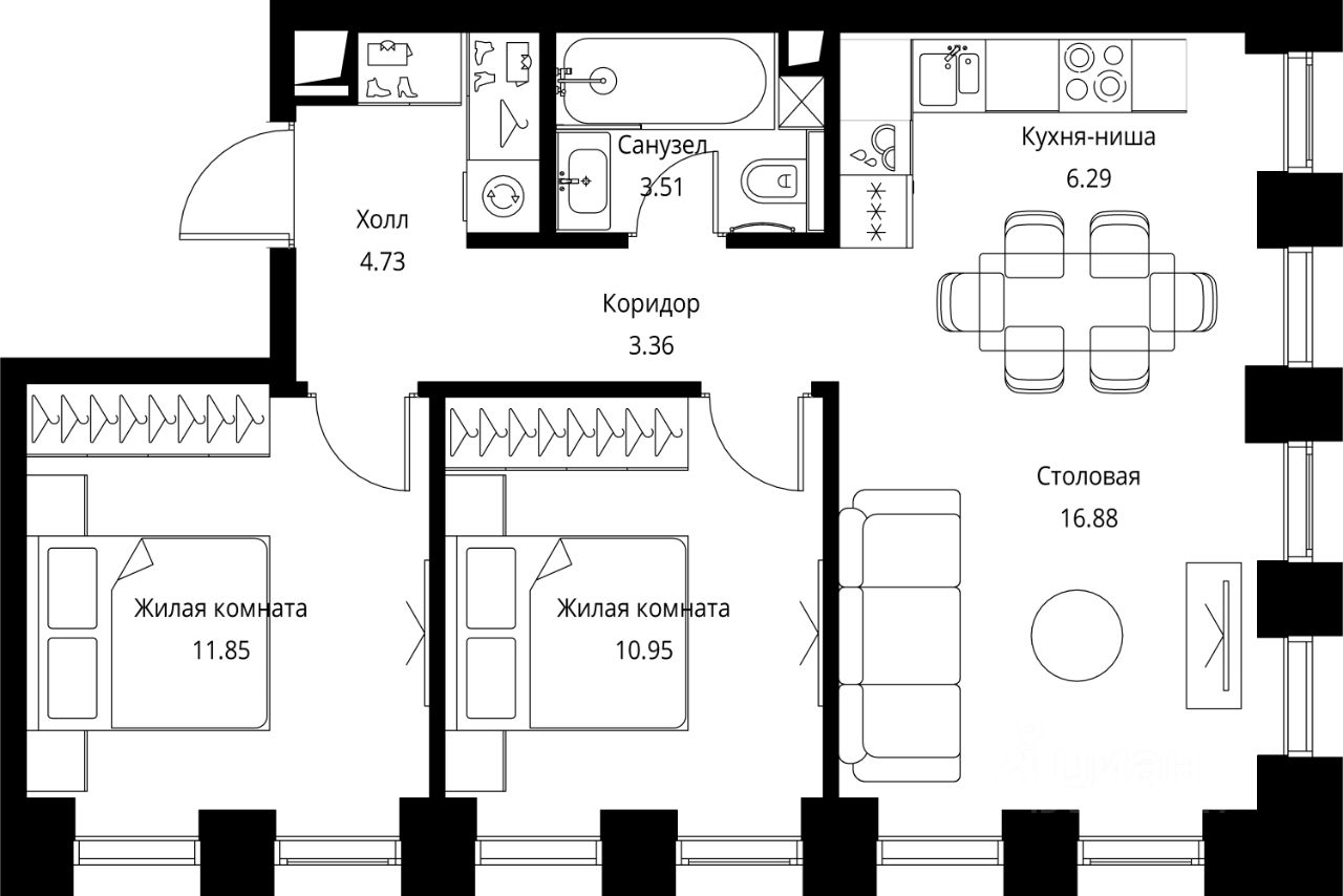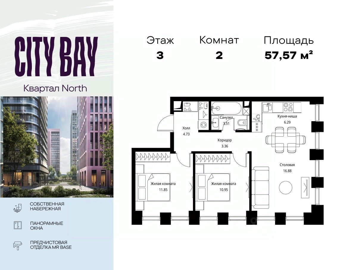 Продаётся 2-комнатная квартира общей площадью 57.57 м² с предчистовой отделкой в ЖК City Вау, квартале North, на 3-м этаже 26 этажного дома.