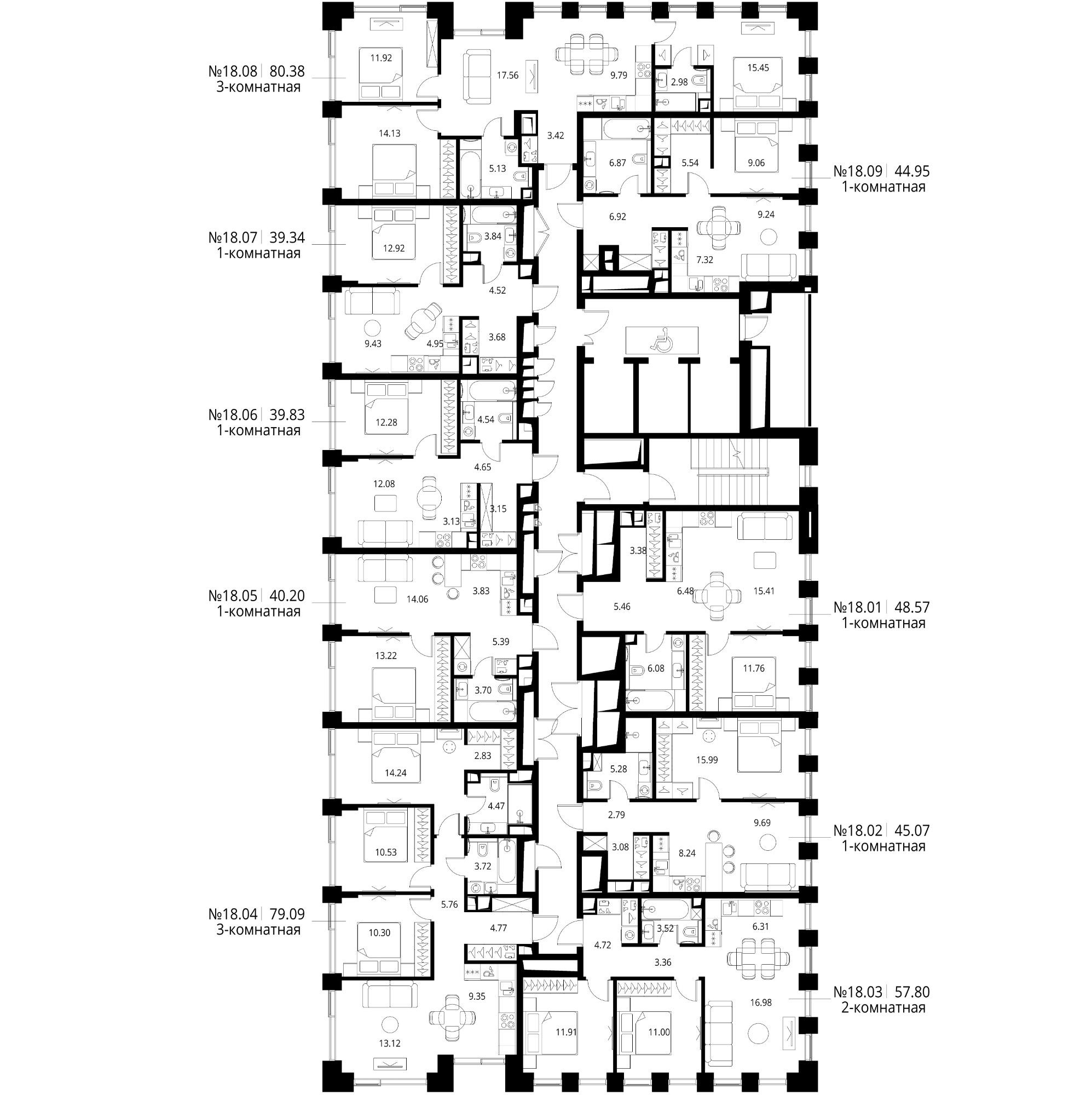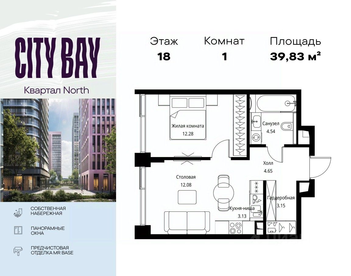 Продаётся 1-комнатная квартира общей площадью 39.83 м² с предчистовой отделкой в ЖК City Вау, квартале North, на 18-м этаже 26 этажного дома.
