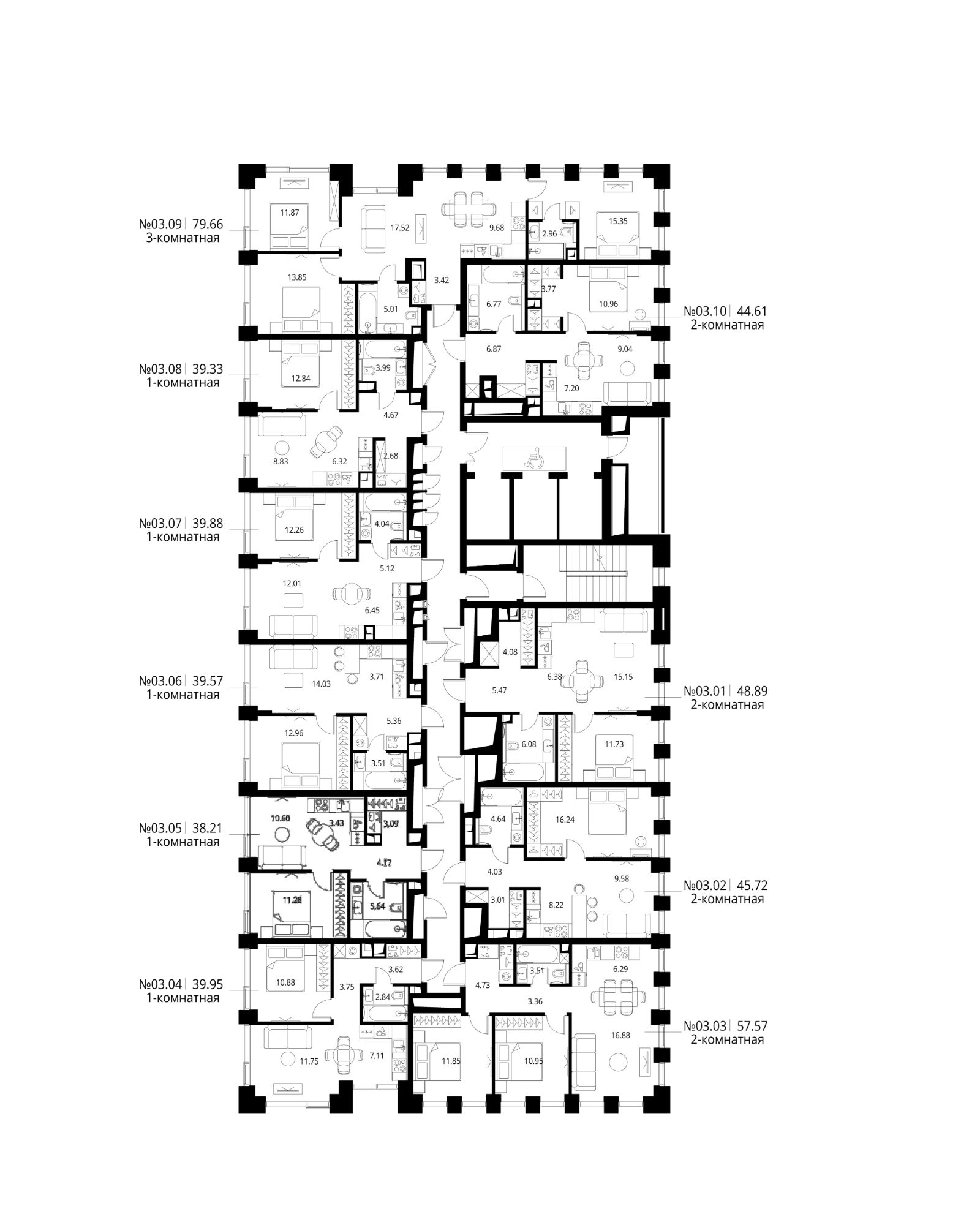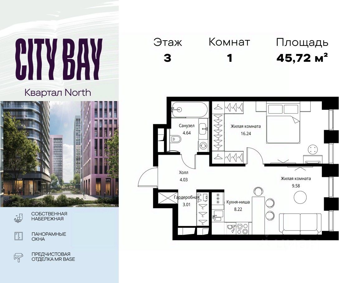 Продаётся 1-комнатная квартира общей площадью 45.72 м² с предчистовой отделкой в ЖК City Вау, квартале North, на 3-м этаже 26 этажного дома.