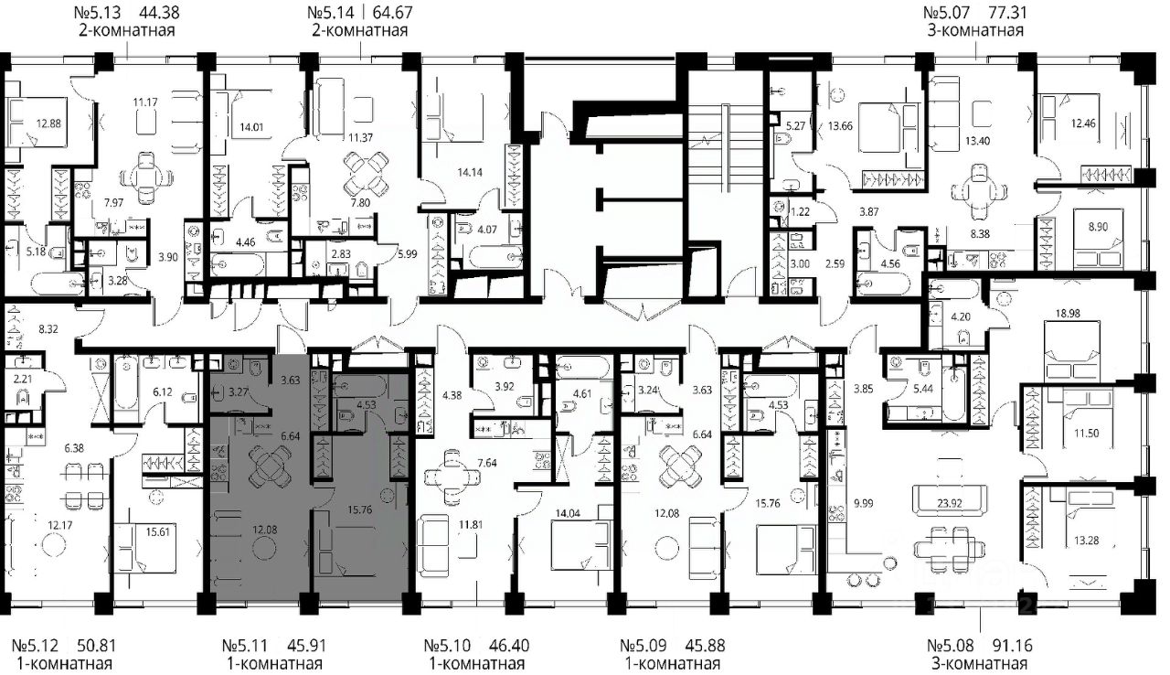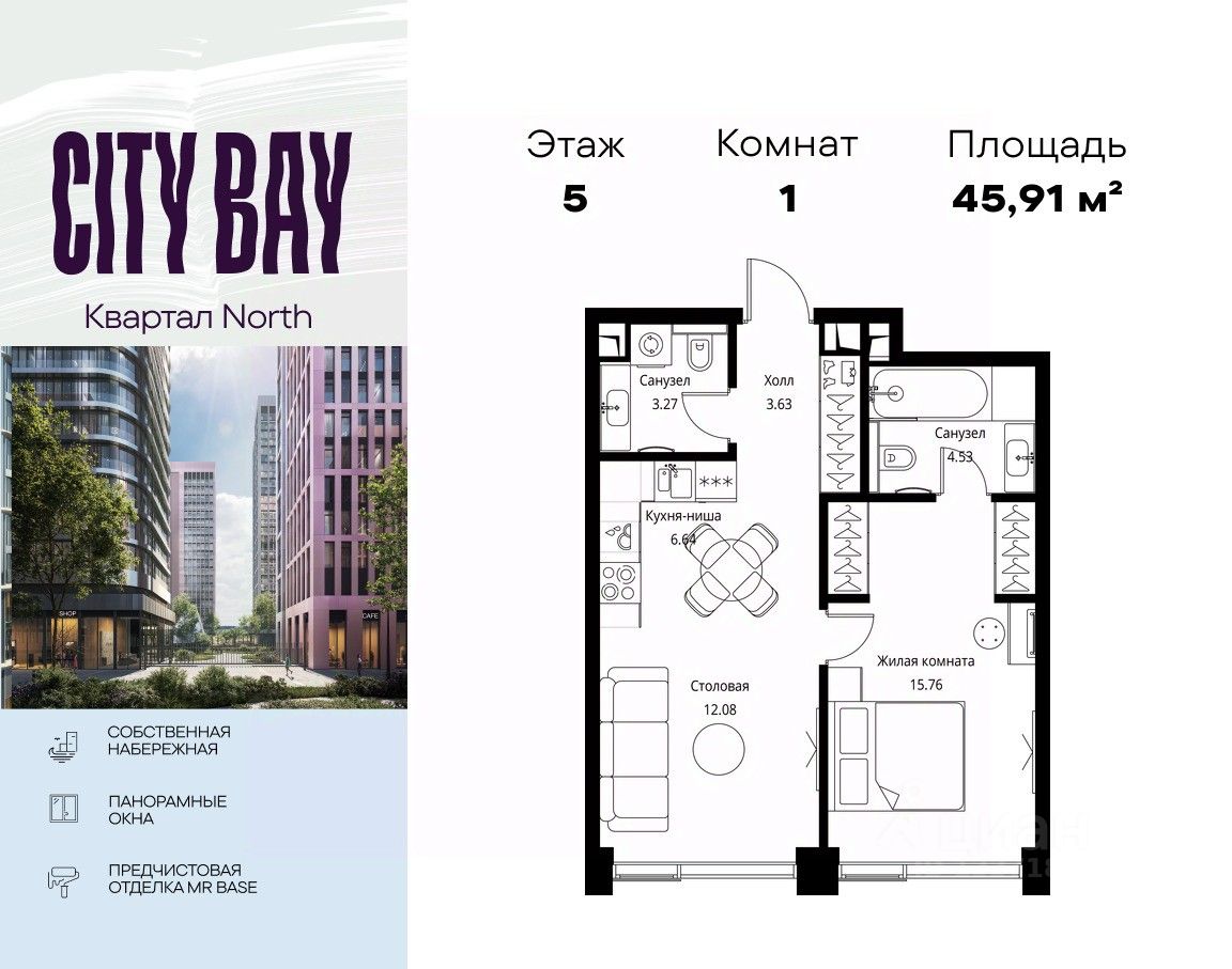 Продаётся 1-комнатная квартира общей площадью 45.91 м² с предчистовой отделкой в ЖК City Вау, квартале North, на 5-м этаже 10 этажного дома.