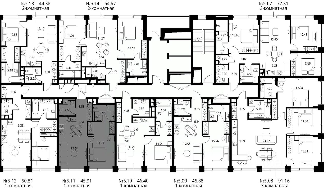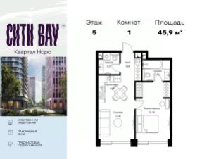 Продаётся 1-комнатная квартира общей площадью 45.91 м² с предчистовой отделкой в ЖК Сити Бэй, квартале Норс, на 5-м этаже 10 этажного дома.