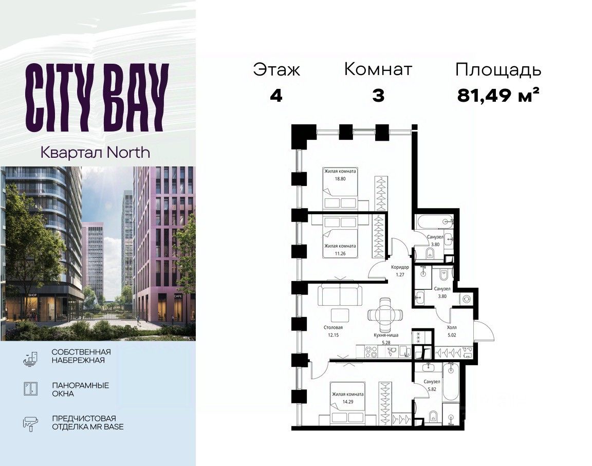 Продаётся 3-комнатная квартира общей площадью 81.49 м² с предчистовой отделкой в ЖК City Вау, квартале North, на 4-м этаже 27 этажного дома.