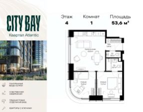 Продаётся 1-комнатная квартира общей площадью 53.60 м² с предчистовой отделкой в ЖК City Вау на 4-м этаже 53 этажного дома.