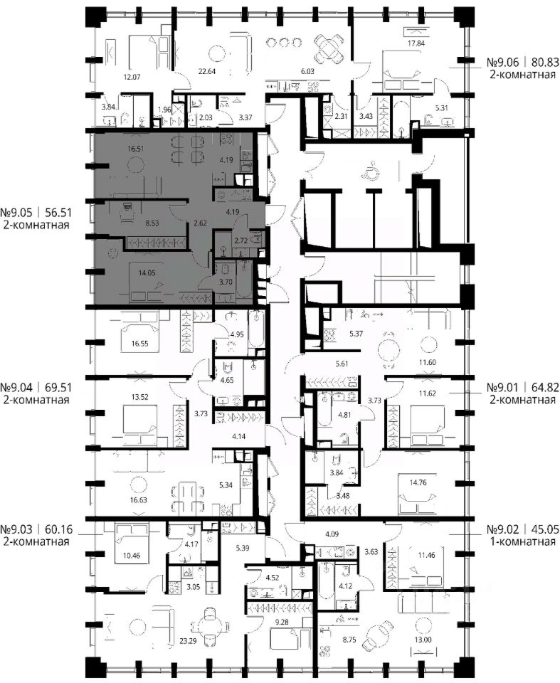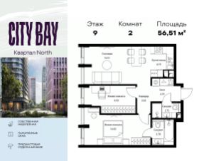 Продаётся 2-комнатная квартира общей площадью 56.51 м² с предчистовой отделкой в ЖК City Вау, квартале North, на 9-м этаже 17 этажного дома.