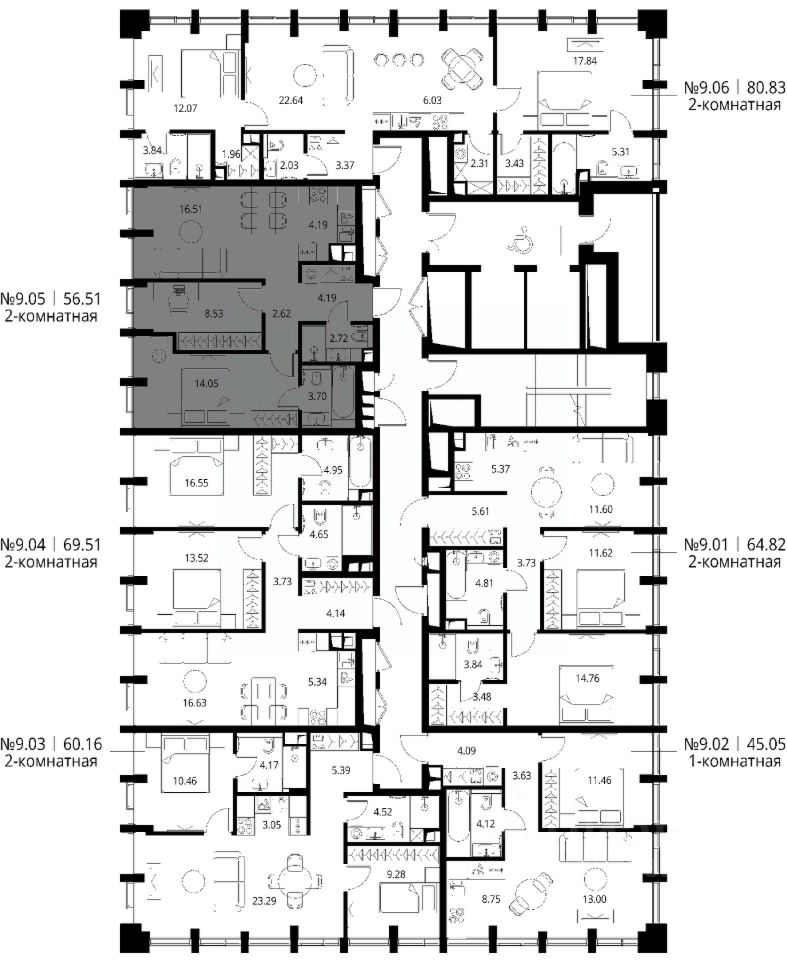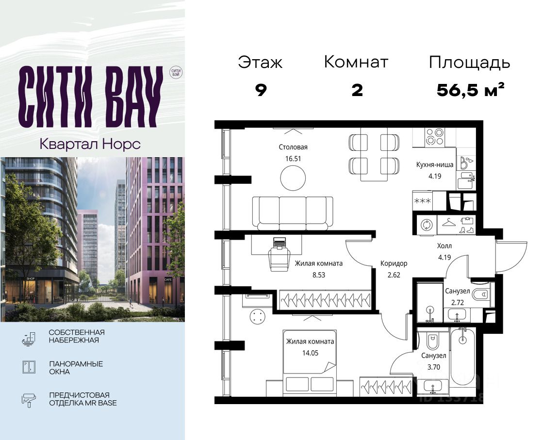 Продаётся 2-комнатная квартира общей площадью 56.51 м² с предчистовой отделкой в ЖК Сити Бэй, квартале Норс, на 9-м этаже 17 этажного дома.
