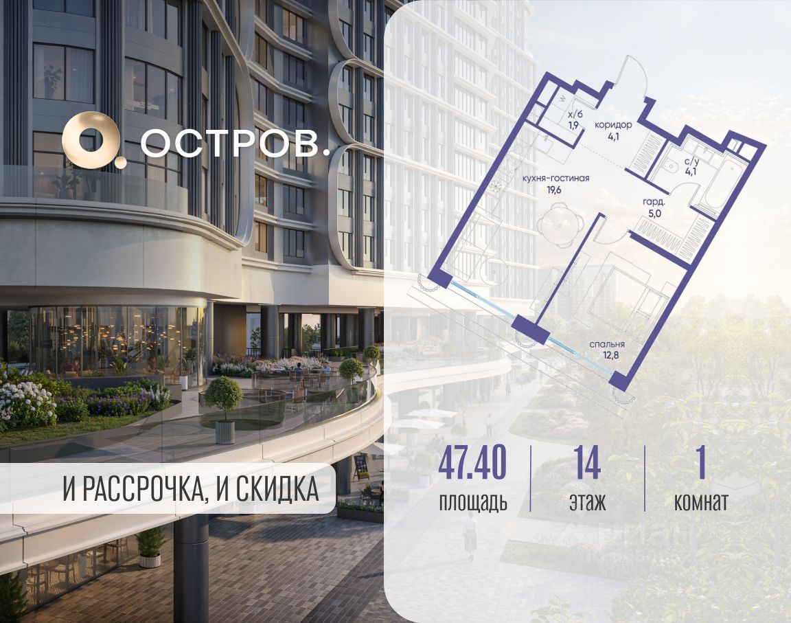 Продаётся однокомнатная квартира  от застройщика: общая площадь 47.40 м², жилая 12.80 м², кухня 19.60 м², 14, жилой квартал "Остров 7", корпус 7 (7 квартал) (секция 1).  срок сдачи: 4-кв. 2025.
