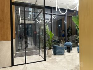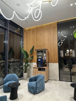 Дизайн лобби - современная классика в тёмных и светлых тонах, строгие формы, стальные элементы под латунь, натуральные камни и окна в пол, создающие атмосферу торжественности и умиротворения,