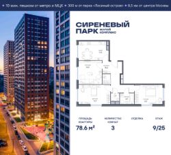 Продаётся просторная 3-комнатная квартира общей площадью 78.6 м² на 9 этаже в новом жилом комплексе "Сиреневый парк", расположенном в Восточном административном округе Москвы на улице Тагильская. Всего 10 минут ходьбы от станции метро "Бульвар Рокоссовского" и одноимённой платформы МЦК.