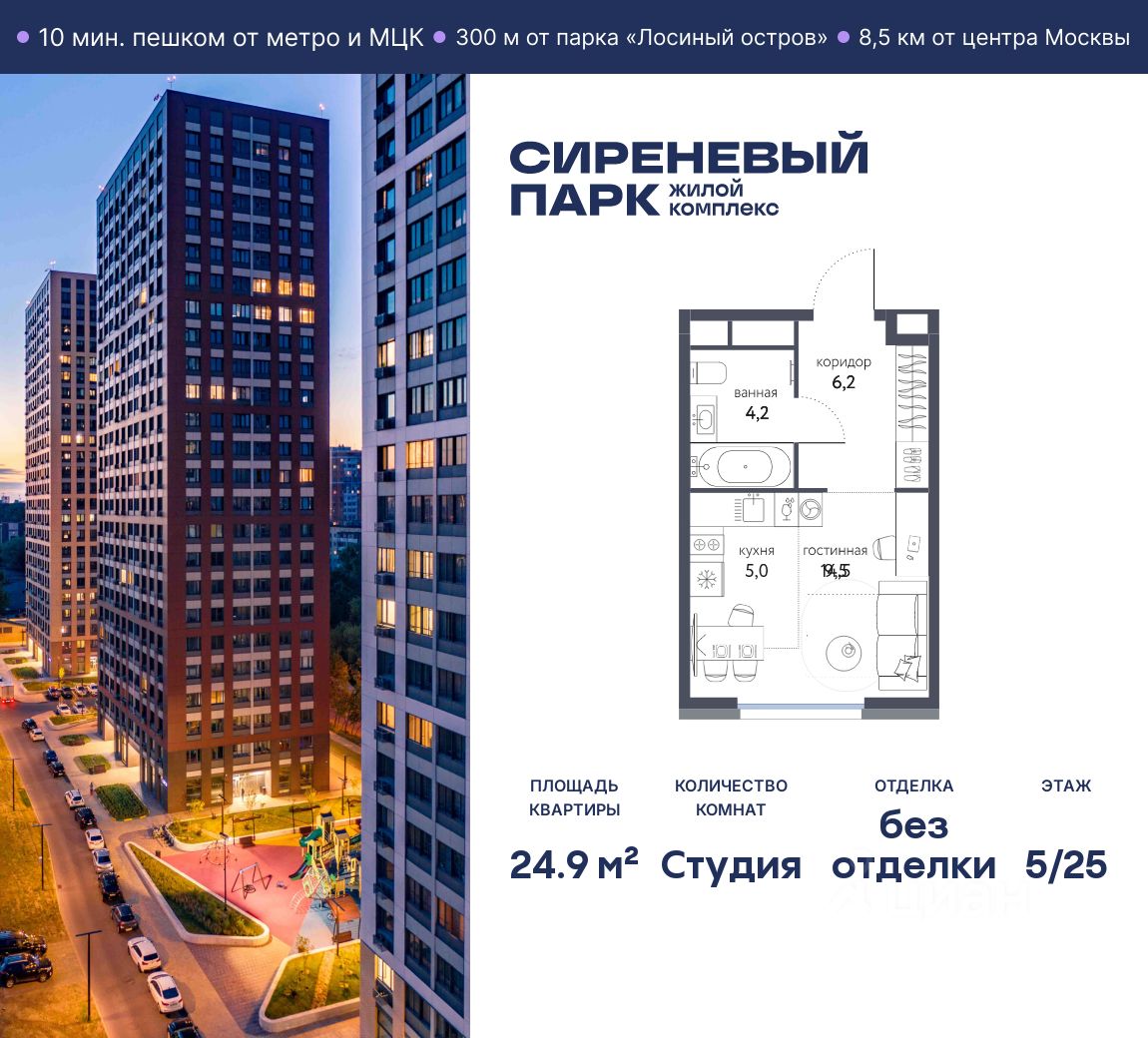 Продаётся просторная студия общей площадью 24.9 м² на 5 этаже в новом жилом комплексе "Сиреневый парк", расположенном в Восточном административном округе Москвы на улице Тагильская. Всего 10 минут ходьбы от станции метро "Бульвар Рокоссовского" и одноимённой платформы МЦК.