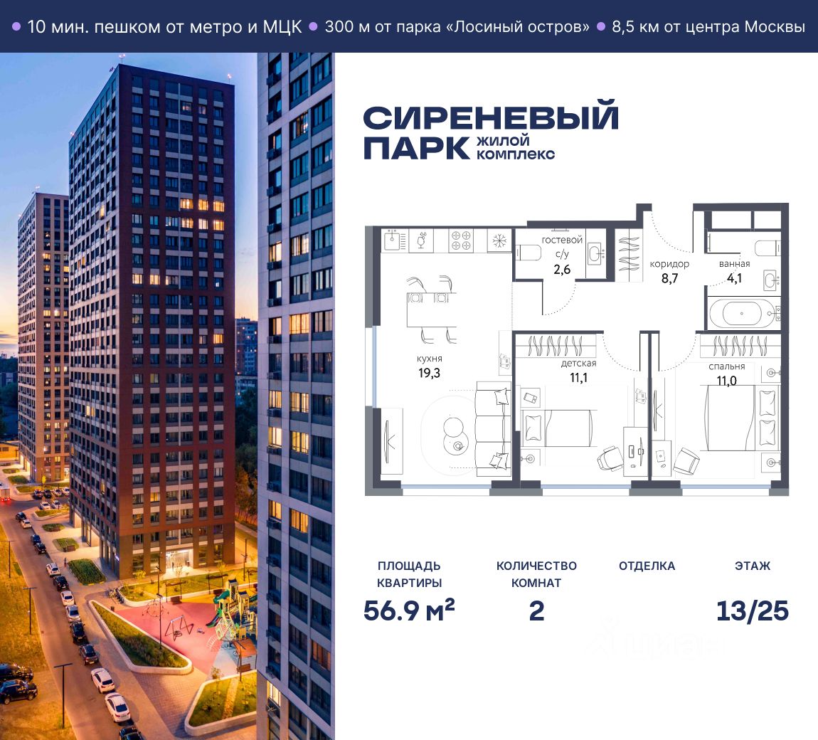 Продаётся просторная 2-комнатная квартира общей площадью 56.9 м² на 13 этаже в новом жилом комплексе "Сиреневый парк", расположенном в Восточном административном округе Москвы на улице Тагильская. Всего 10 минут ходьбы от станции метро "Бульвар Рокоссовского" и одноимённой платформы МЦК.