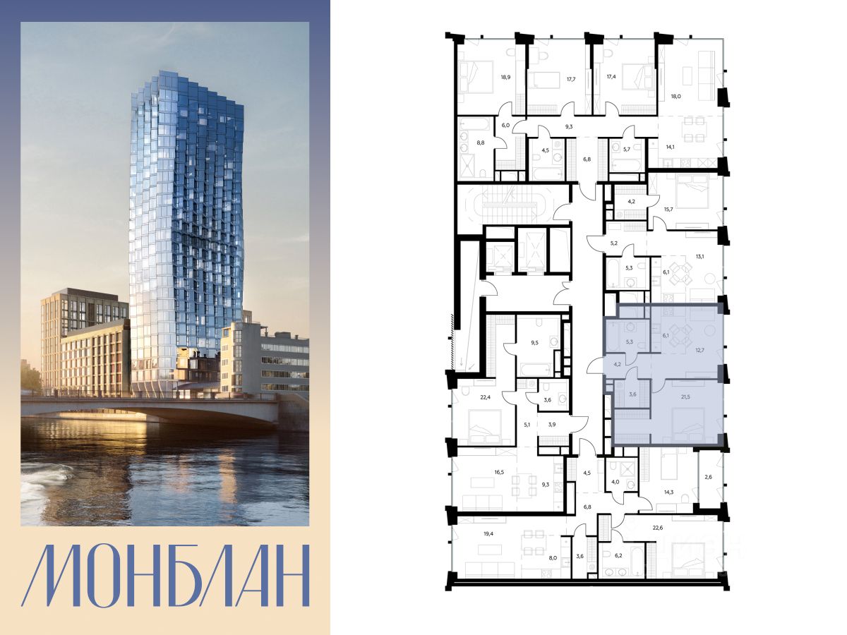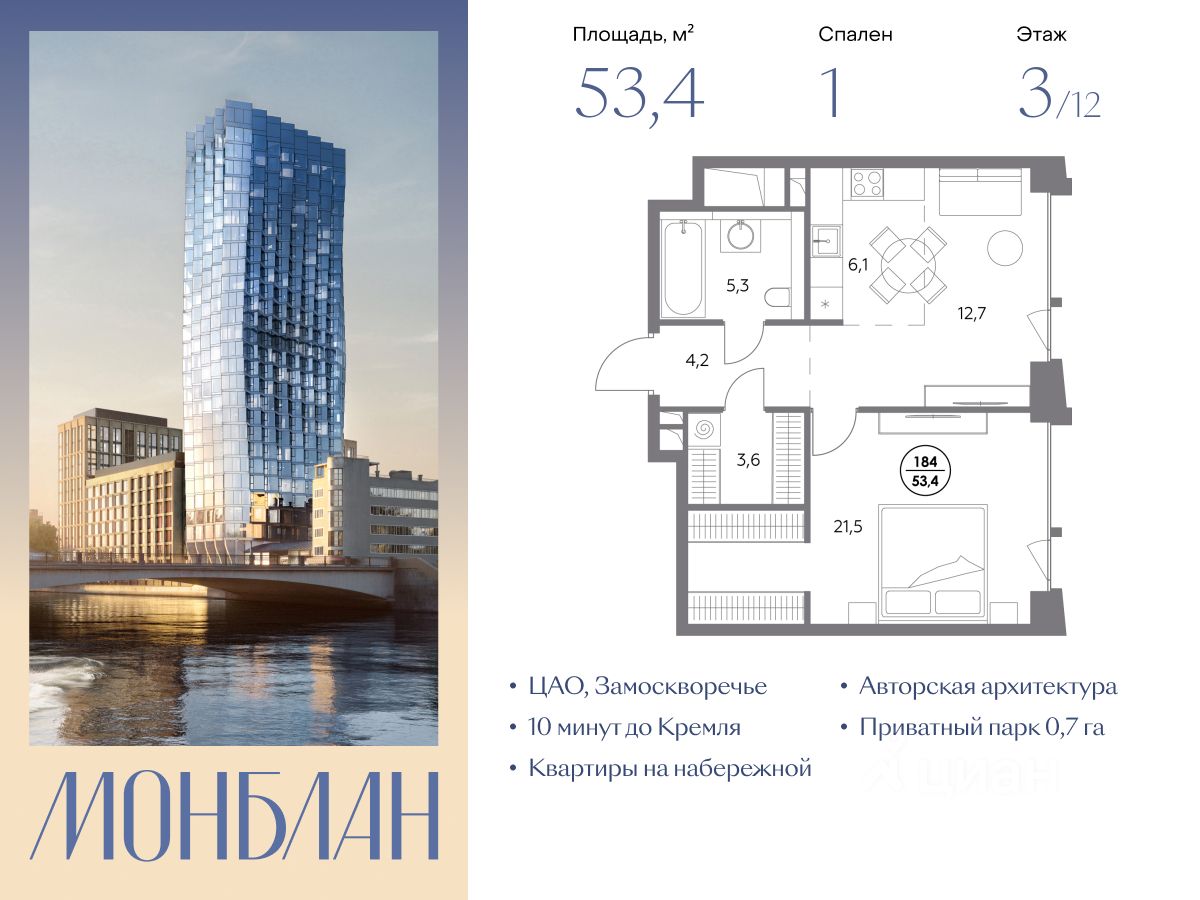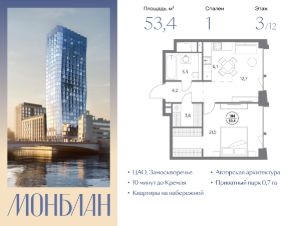 В элитном жилом комплексе "Монблан" на Шлюзовой набережной в Замоскворечье напрямую от девелопера ГК "Галс-Девелопмент" представлена 1-комнатная квартира квартира на 3 этаже общей площадью 53.40 м².