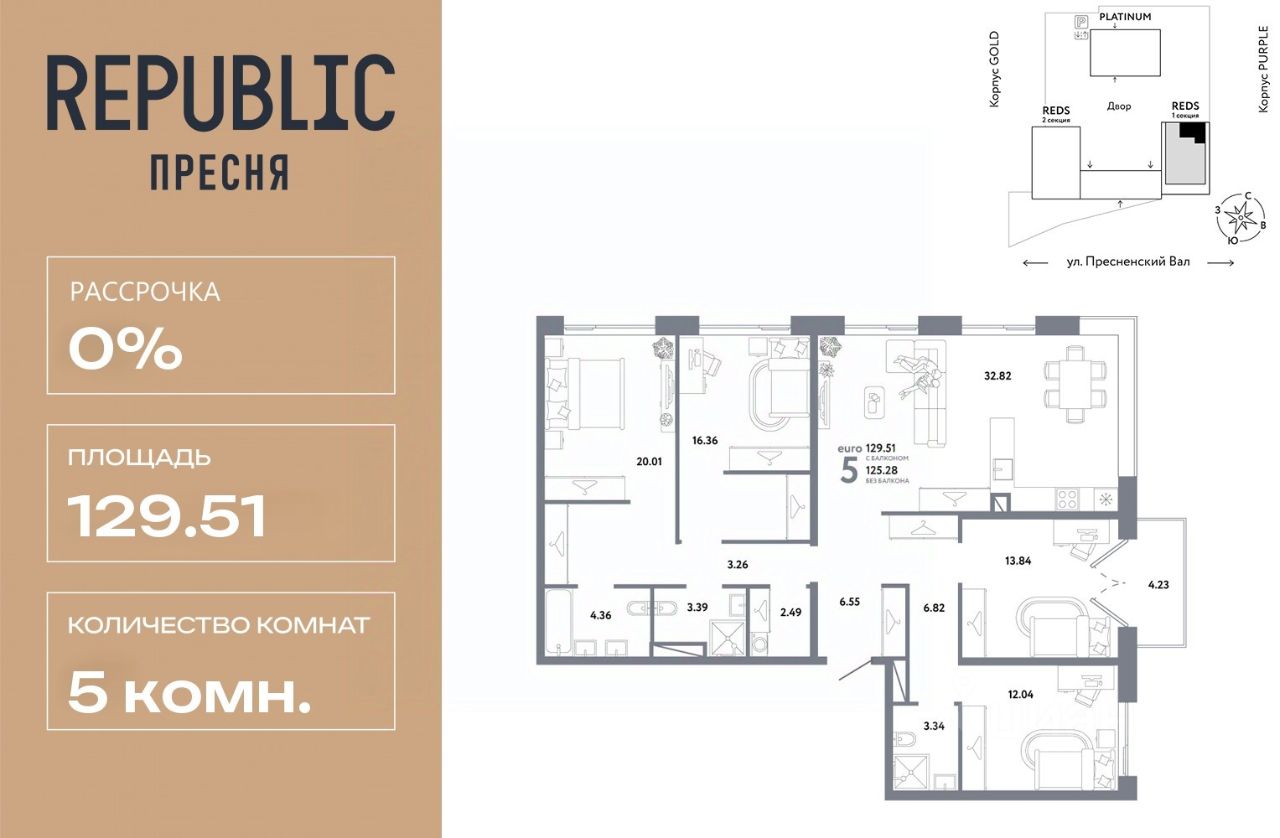 Продается 5комнатная квартира на 22 этаже от застройщика Страна Девелопмент. Площадь квартиры 129,51 кв. м.
