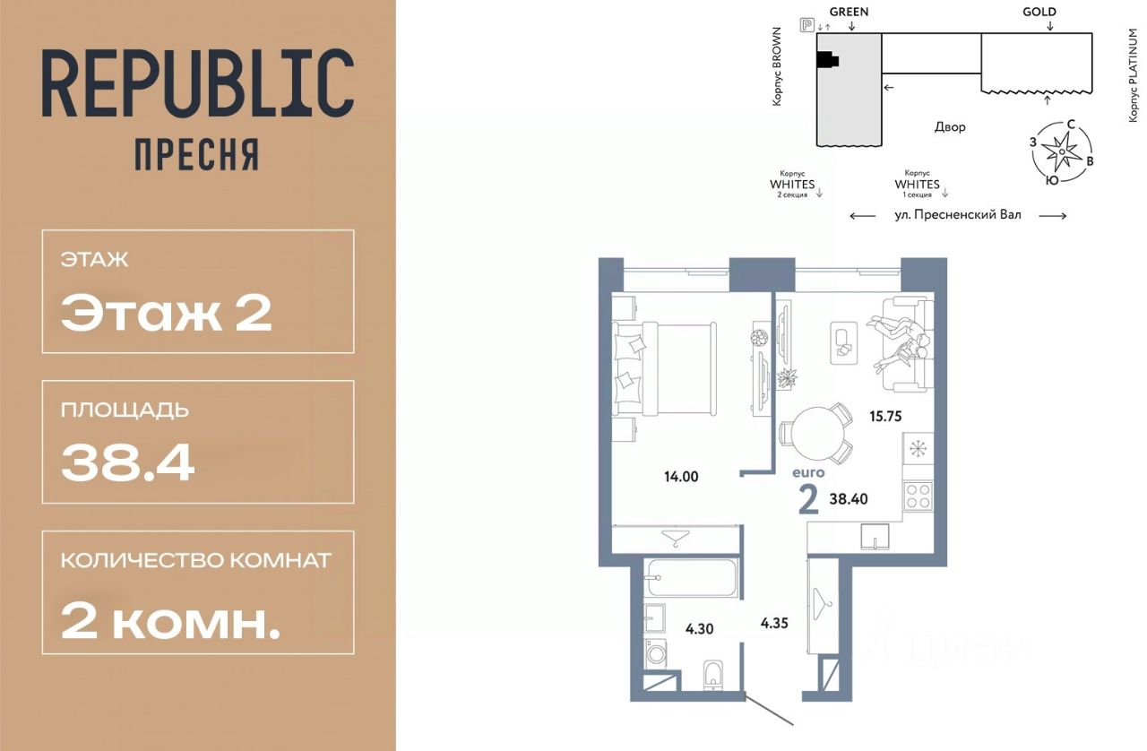 Продается 2комнатная квартира на 2 этаже от застройщика Страна Девелопмент. Площадь квартиры 38,4 кв. м.