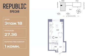 Продается 1комнатная квартира на 18 этаже от застройщика Страна Девелопмент. Площадь квартиры 27,36 кв. м.