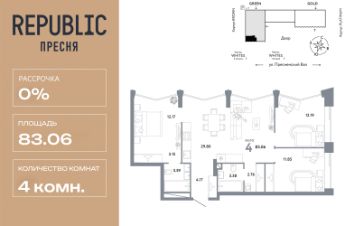 Продается 4комнатная квартира на 27 этаже от застройщика Страна Девелопмент. Площадь квартиры 83,06 кв. м.