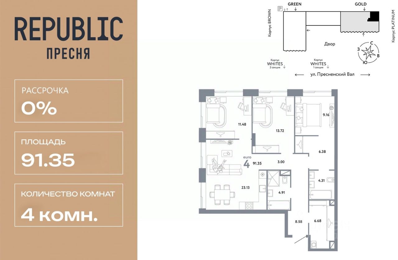 Продается 4комнатная квартира на 12 этаже от застройщика Страна Девелопмент. Площадь квартиры 91,35 кв. м.