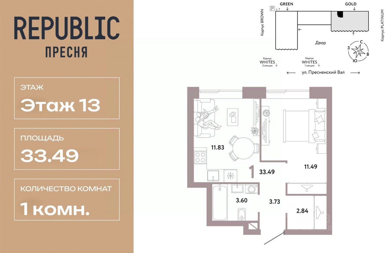 Продается 1комнатная квартира на 13 этаже от застройщика Страна Девелопмент. Площадь квартиры 33,49 кв. м.