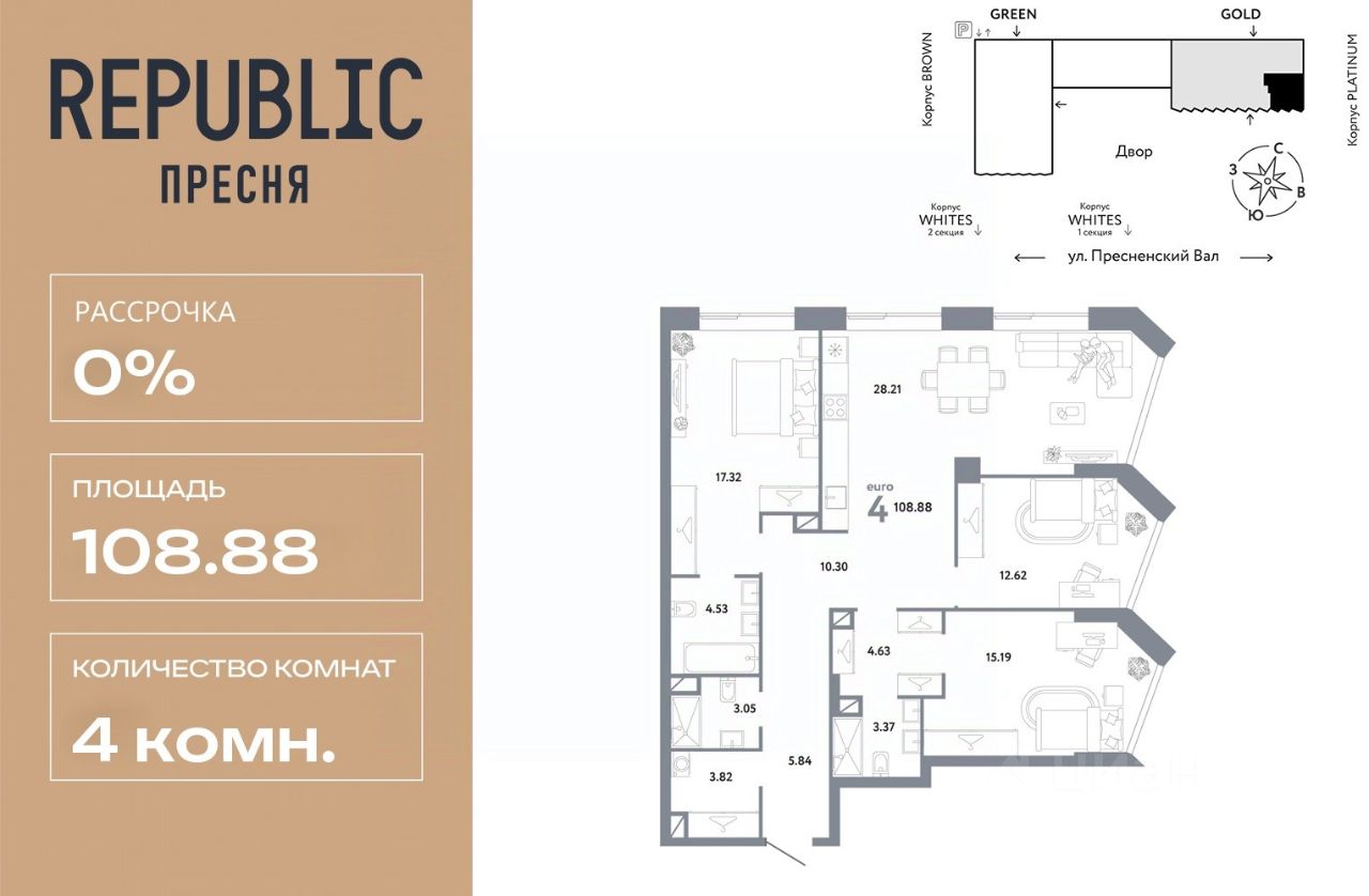 Продается 4комнатная квартира на 16 этаже от застройщика Страна Девелопмент. Площадь квартиры 108,88 кв. м.