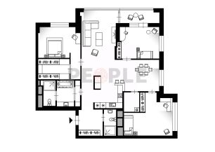 Квартира оснащена дизайнерской мебелью и предметами в интерьере.