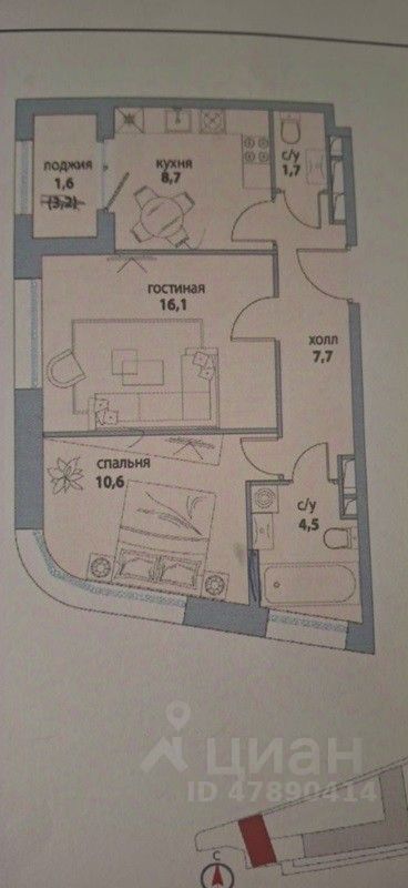 Кухня 11 кв.м. с выходом на лоджию, просторная гостиная 16 кв.м., уютная спальня с панорамными окнами, санузел с окном, совмещенный.