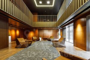 При входе много мест для хранения, гостевой санузел, пространство комнаты разделено на кухню с обеденной зоной, гостиную, спальную зону с гардеробной и санузлом. Территорию спальни можно отделить витражной стеной от общей зоны.