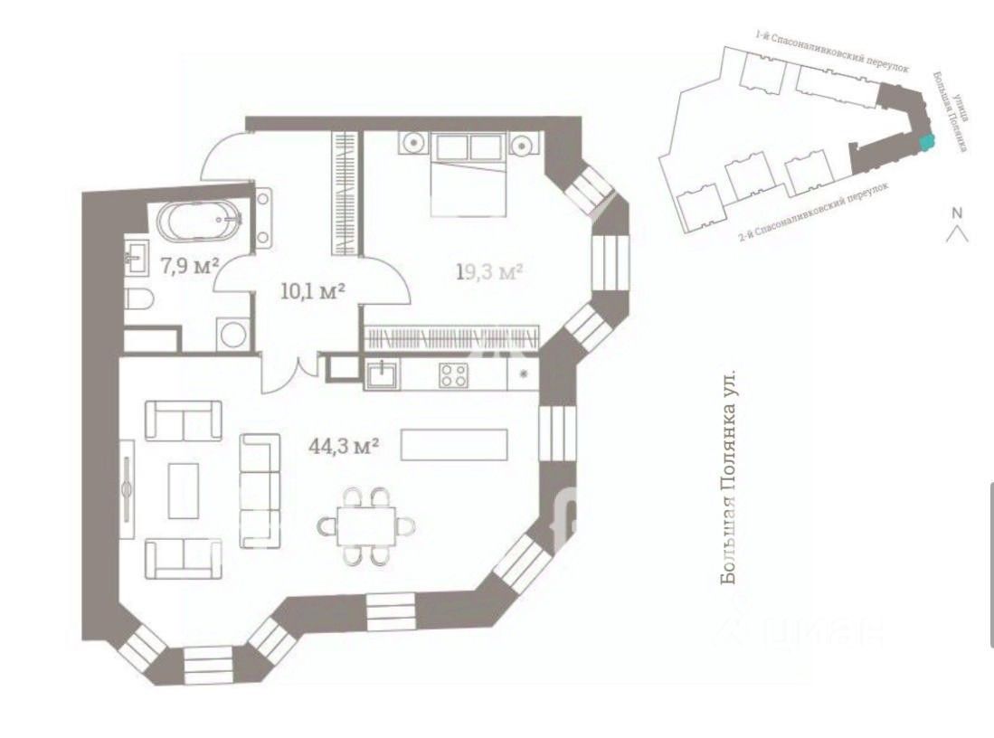 ЖК "Полянка 44" расположился в историческом районе Замоскворечье, всего в двух километрах от Кремля. Комплекс представляет собой реконструкцию здания 1915 года, дополненную пятью новыми домами в английском стиле.