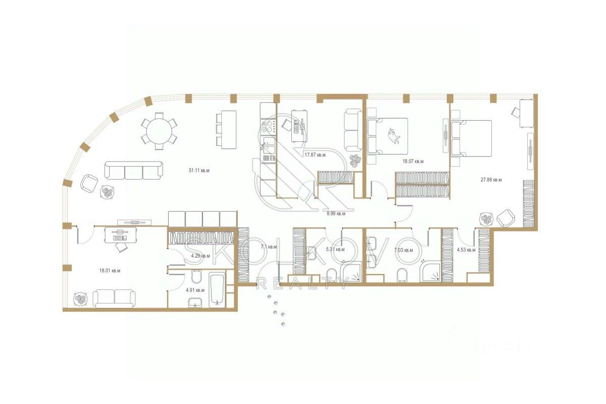 В квартире установлены: индивидуальная система кондиционирования, техника Miele, Liebherr, кухня Binova.