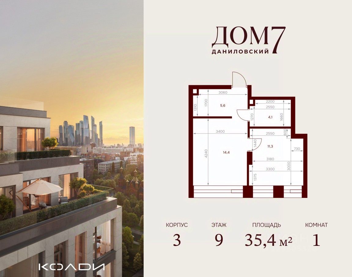 Продается 1-к квартира общей площадью 35.40 кв.м на 9 этаже в жилом квартале премиум-класса "Дом 7 Даниловский".