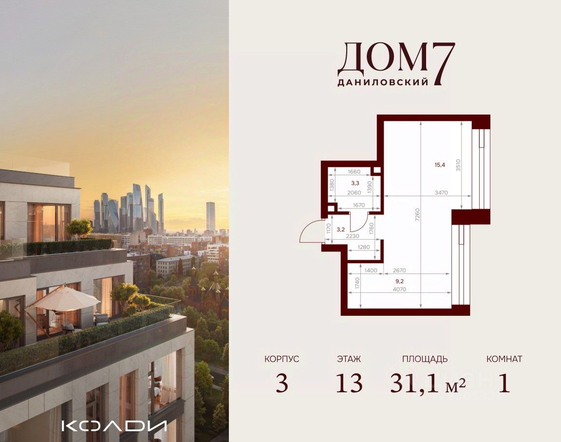Продается 1-к квартира общей площадью 31.10 кв.м на 13 этаже в жилом квартале премиум-класса "Дом 7 Даниловский".